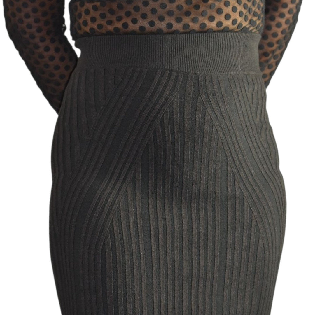 Elevate your wardrobe with this sleek and sophisticated black ribbed knit pencil skirt from French Connection. This skirt features a flattering high-waist fit and a figure-hugging, bodycon silhouette that ends at a chic midi length. The wide-rib texture adds dimension and a cozy-yet-chic feel, making it perfect for office wear, date nights, or effortless layering.