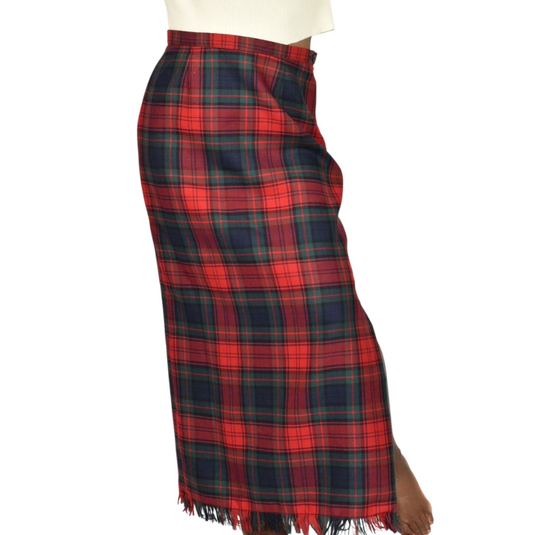 Vintage Rafaella Sport tartan skirt FEATURES a column straight silhouette with red tartan plaid pattern. Fringe hem. High side slit. Side zip closure. Maxi length. Lined.